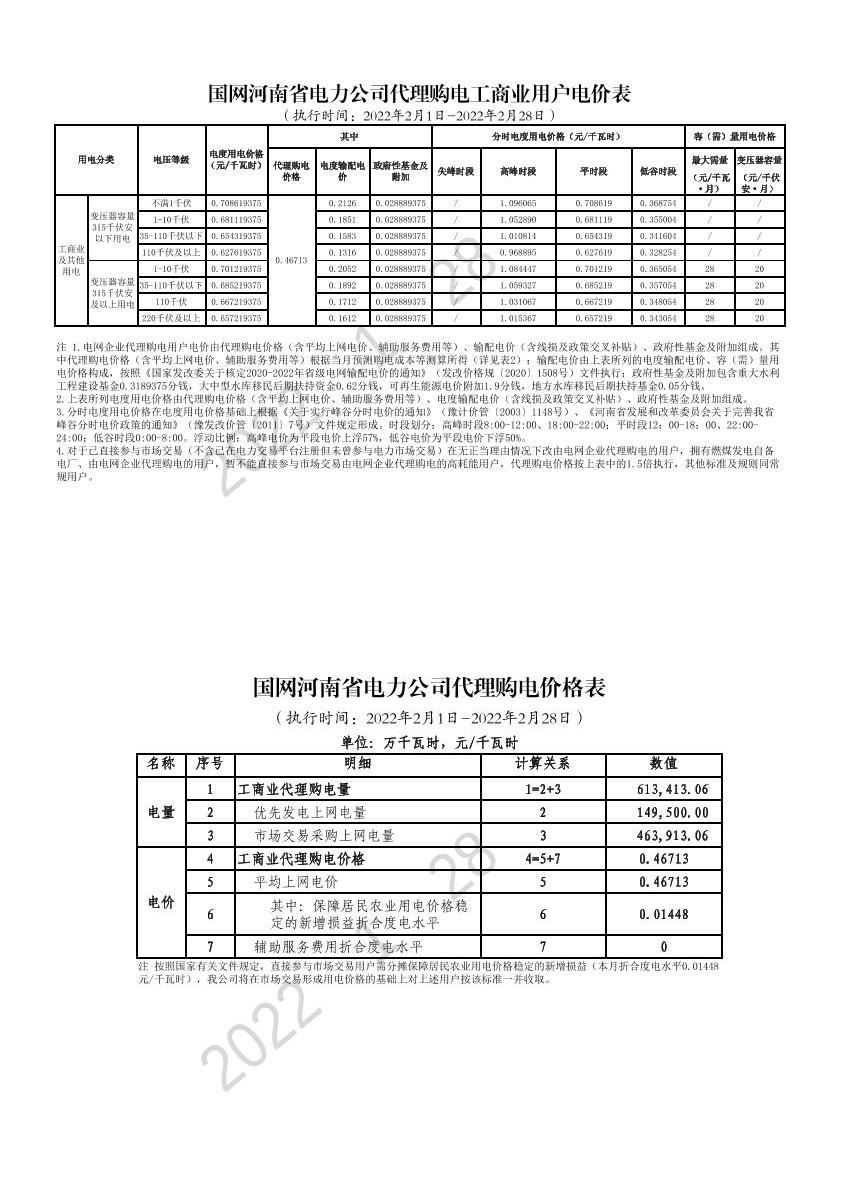 2022年2月国网河南省电力公司代理购电工商业用户电价表