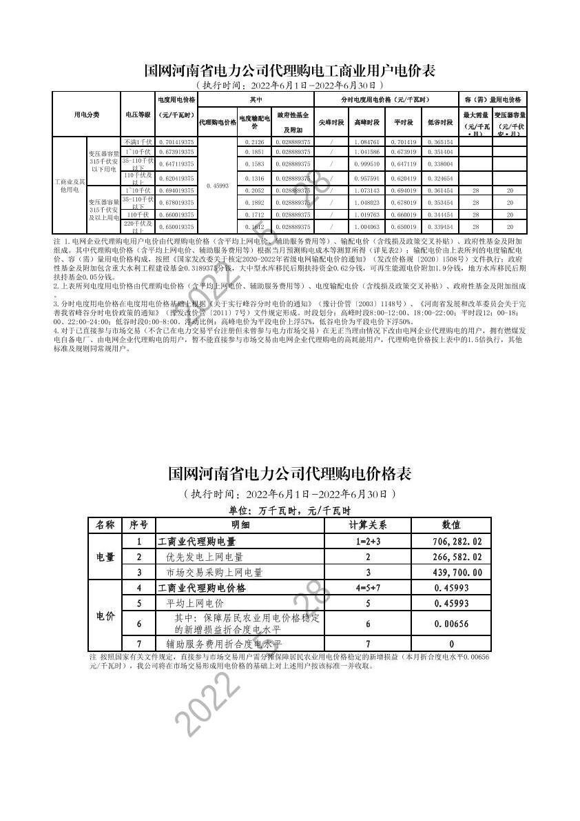 2022年6月国网河南省电力公司代理购电工商业用户电价表