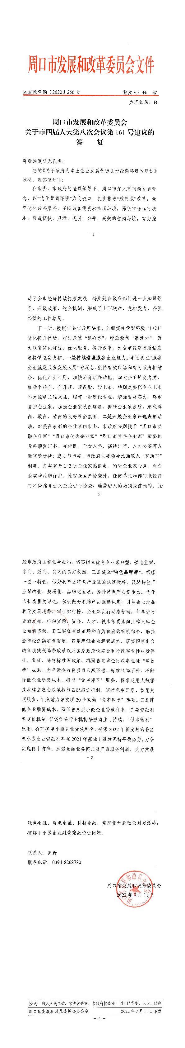 周口市发展和改革委员会关于市四届人大第八次会议第161号建议的答复
