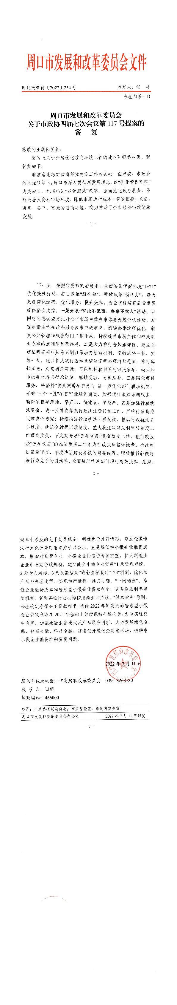 周口市发展和改革委员会关于市政协四届七次会议第117号提案的答复