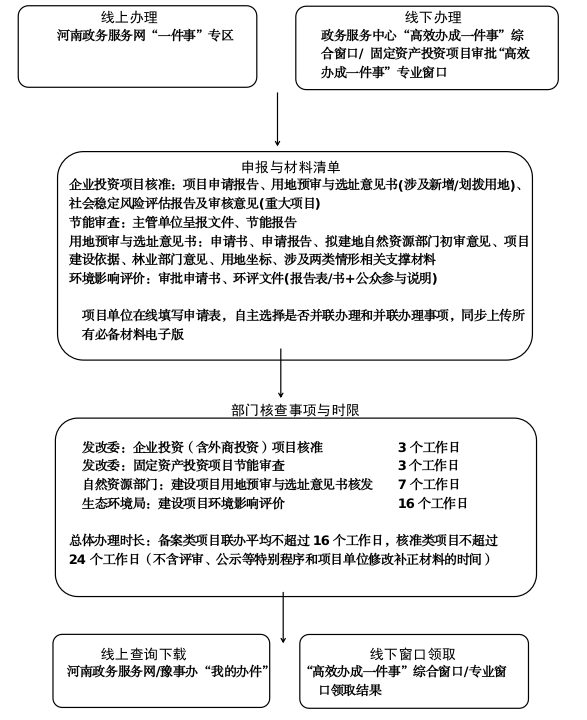 1.信息填报:项目单位通过法人账号登录河南政务服务网“一件事”专区(或前往线下窗口),在线填写申请表,自主选择并联办理的具体事项,并同步上传必备材料电子版。