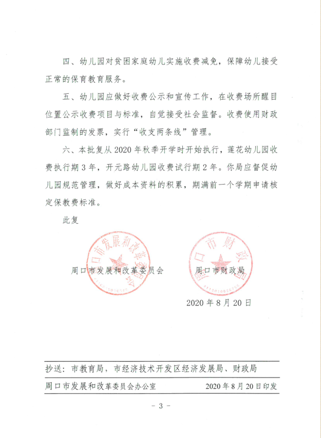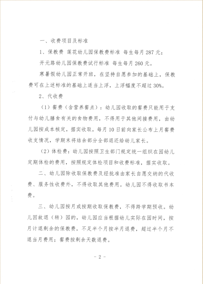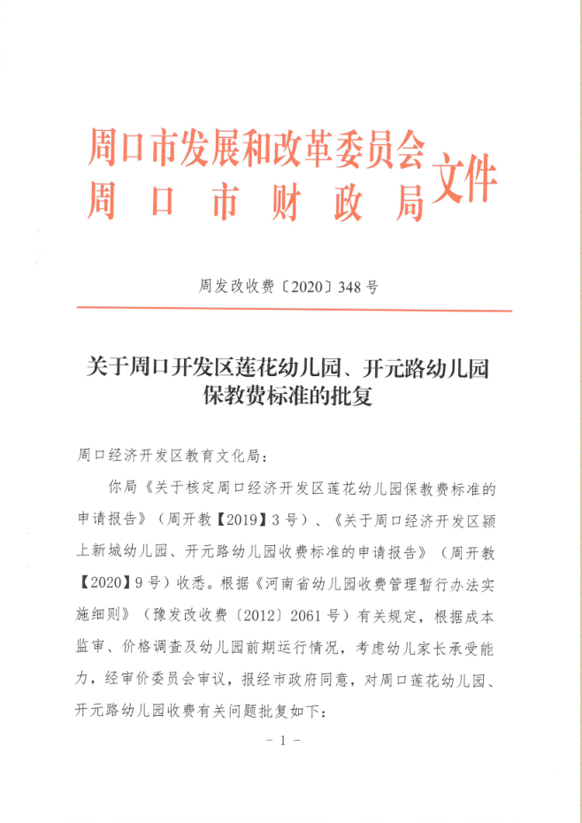关于周口开发区莲花幼儿园、开元路幼儿园保教费标准的回复